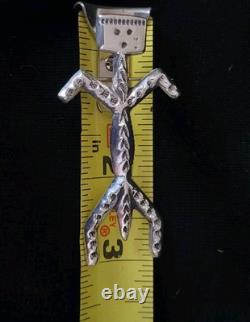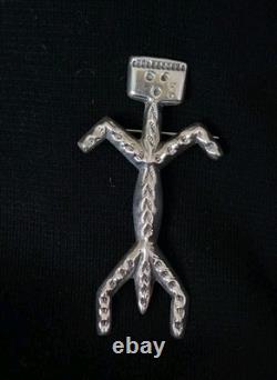 This vintage Navajo brooch pin features a sand cast design of a Kachina figure, made of sterling silver. The piece weighs 15.6 grams and measures 3 inches in size. It reflects Native American artistry and craftsmanship, specifically from the Navajo tribe in the United States.