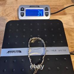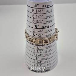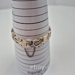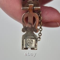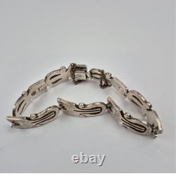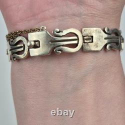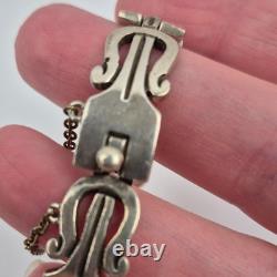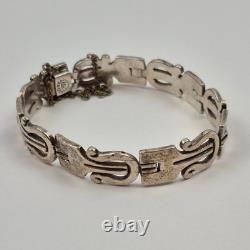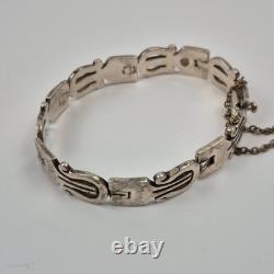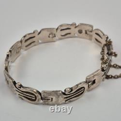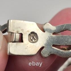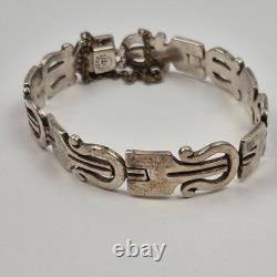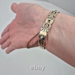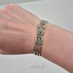 Superbe bracelet en argent sterling vintage de Taxco, présentant le marquage Eagle 3 très recherché, datant des années 1950-1970. Cette pièce d'exception, finement travaillée, met en avant un design audacieux du milieu du siècle avec une touche de style boho. Nettoyé délicatement pour préserver sa patine d'origine. Origine : Taxco, Mexique Métal : Argent sterling (marqué, poinçon Eagle 3) Époque : Environ années 1950-1970 Poids : Environ 34 grammes (pesé sur une balance postale) Taille : 16,5 cm de circonférence intérieure Style : Maillon en panneau, boho, artisanal, déclaration Fermoir : Fermoir à boîte avec chaîne de sécurité État : Bon état vintage - légère usure conforme à l'âge (voir photos) Nettoyé délicatement pour conserver le caractère vintage Une pièce de collection pour les passionnés de Taxco, les amoureux de l'argent sterling et les fans de bijoux artisanaux uniques.