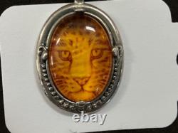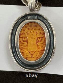 Chaîne en argent sterling vintage 22 avec pendentif en camée d'ambre sculpté à l'envers léopard/jaguar - C'est le top ! - Une excellente addition à votre collection de bijoux ! - Chaîne et cadre de camée avec poinçon.