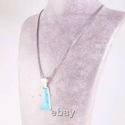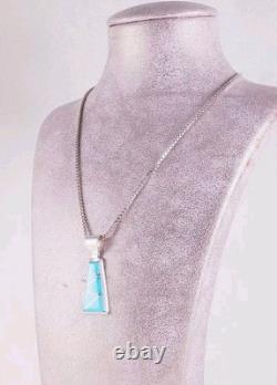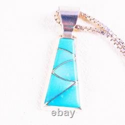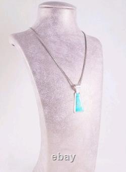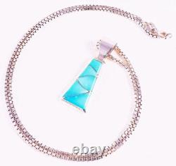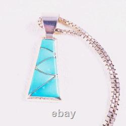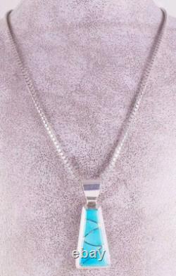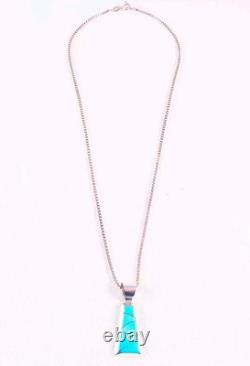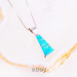 Collier Pendentif en Argent Sterling avec Incrustation de Turquoise. Joli avec une belle touche de couleur, ce collier pendentif ajoutera une allure joyeuse à n'importe quelle tenue. Fabriqué à la main en argent sterling, de belles tranches de turquoise bleu vif sont disposées pour créer ce magnifique pendentif. Suspendu à une chaîne en boîte de 1,7 mm, cet article illuminera n'importe quel look. Ce collier est en excellent état avec des signes d'usure normale.