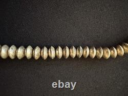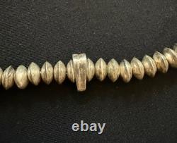 Collier vintage en argent sterling Navajo avec perles en forme de melon - 22 pouces - 48 grammes - Trouvaille de succession non polie. Ce magnifique collier vintage présente un brin complet de perles en argent sterling faites à la main, attribuées aux artisans argentiers Navajos et datant probablement des années 1970 ou avant. Chaque perle cannelée (striée) a été fabriquée individuellement dans le style traditionnel Navajo "bench bead" - légèrement arrondie, avec une couture centrale, et oxydée pour accentuer sa texture et sa profondeur. Le collier mesure 22 pouces de long et pèse un poids substantiel de 48 grammes, lui conférant une silhouette élégante et drapée. Il est monté sur son fil original et terminé par des cônes en argent faits à la main et coniques, ainsi qu'un fermoir à crochet et œil, tous présentant de fins signes d'âge et d'authenticité.