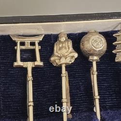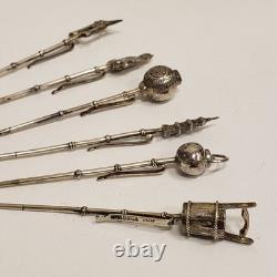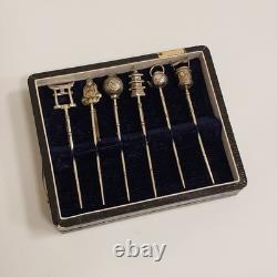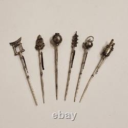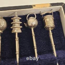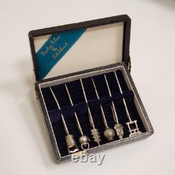 Poinçonné : Argent sterling par Schildkraut / Japon Sterling. Six représentations figuratives traditionnelles au bout de six pique-niques. Toujours dans la boîte d'origine. Longueur moyenne du pic : 3 pouces. Poids total des six pics : 0,405 oz / 12,6 grammes.