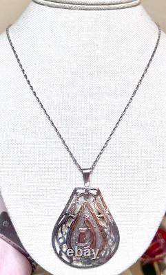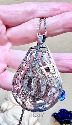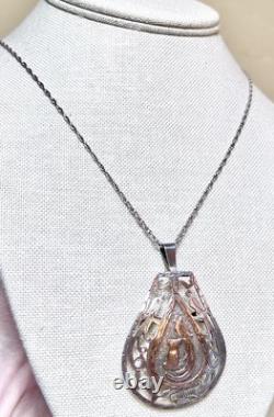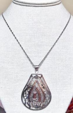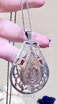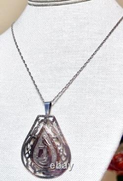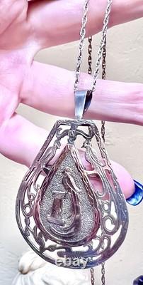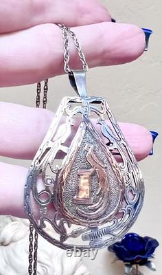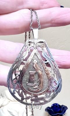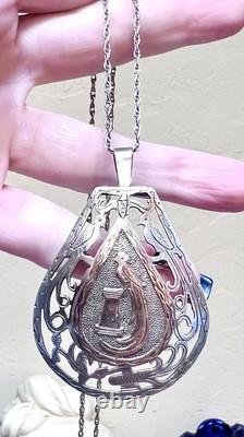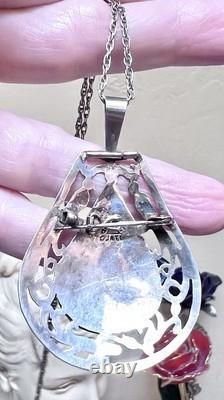Ce pendentif/épingle est une véritable œuvre d'art avec un artisanat et un savoir-faire impressionnants. Il est suspendu à une très belle chaîne en argent sterling de designer vintage, signée, qui mesure 19 pouces de long et qui a un fermoir à anneau ressort.